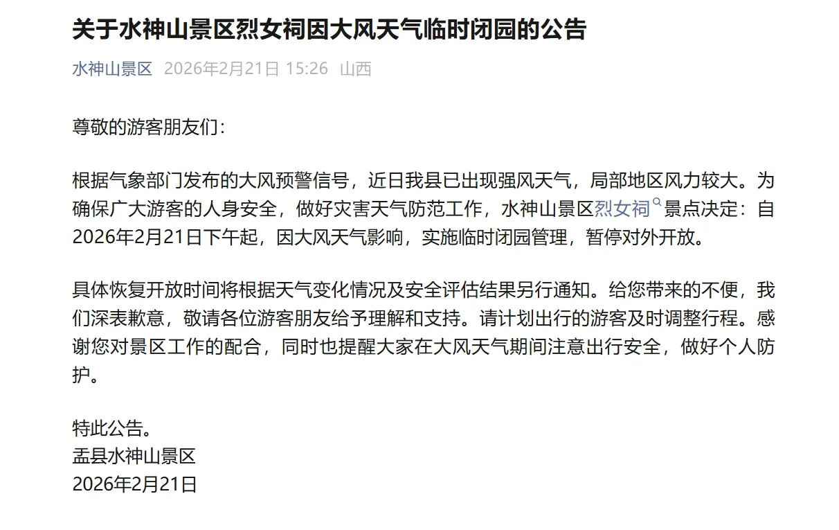 阳泉4家景区临时调整或闭园